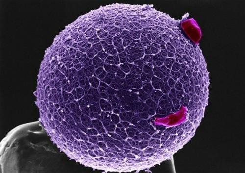 带有冠细胞的人类卵子:这张彩色图片上的紫色人类卵子坐落在一个柱状物上。两个红色冠细胞粘贴在透明带状物上。