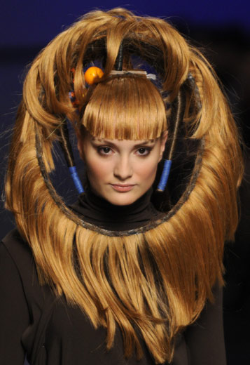 3月16日,模特在乌克兰基辅举行的时尚周上展示造型奇丽的发型设计。
