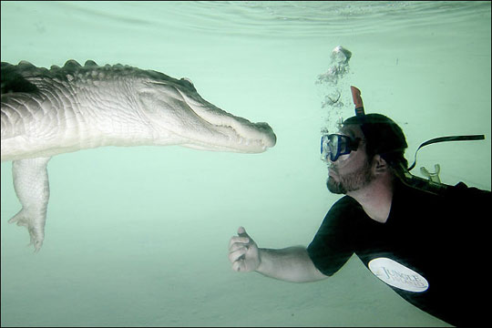 男子与鳄鱼共舞。2009年1月17日,在美国佛州丛林岛动物主题公园,男子Sean Manning与一条9英尺长的美洲鳄在水下上演“人鳄共舞”场面。Sean Manning没有采取任何保护措施,在水下依靠通气管进行呼吸,表演各种高难度动作,为观众上演水下人鳄大战惊险场面。