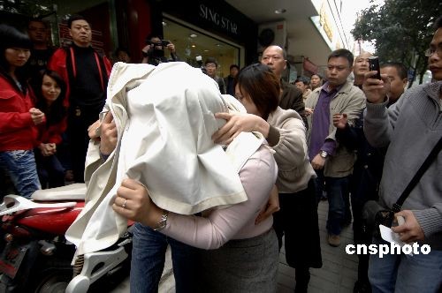 三月二十三日上午十一时十分左右,三名被解救的人质掩面走出典当行。中新社发 王东明 摄