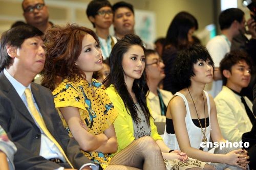 三月二十七日,香港“英皇娱乐十周年盛事发布会”在会展中心举行,英皇娱乐旗下红牌歌星容祖儿与刚刚复出的“阿娇”钟欣桐、泳儿等歌星出席。中新社发 洪少葵 摄