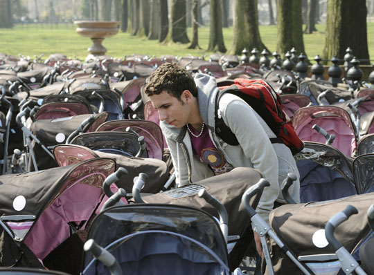 2009年4月2日是第2个世界自闭症日,美国纽约街头150个宝宝玩偶孤独的躺在婴儿车里,呼吁人们对自闭症儿童引起注意。
