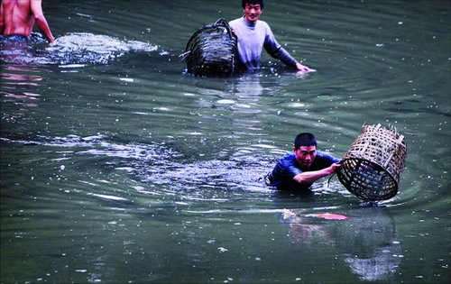 浑浊的池塘水中,无数福寿鱼浮出水面,嘴巴奋力地一张一合。十来个壮年男子站在水中,有人穿着一身衣服,有人仅着底裤;有人拿着塑料袋、竹筐上阵,有人干脆赤手空拳,瞪大眼睛,在浑水中摸鱼。他们的目标不是探手可及、几两重的福寿鱼,而是众多沉在水底、动辄几斤甚至上十斤的大鱼。水不深,但黑黑的淤泥几乎没过摸鱼者的臀部,这令他们举步维艰。(肖海坤)