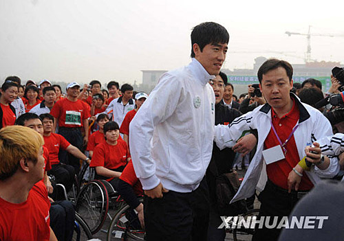 4月12日,刘翔(中)在长跑节活动现场。罗晓光 摄