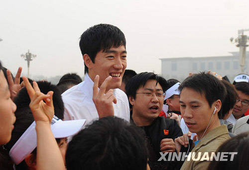 4月12日,刘翔被参加长跑节活动的人们团团围住。当日,2009北京国际长跑节在天安门广场启动。罗晓光 摄