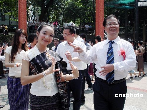 东盟留学生与中国大学生、在场嘉宾一同跳起团圆舞,共庆泼水节的到来。中新社发 黄艳梅 摄