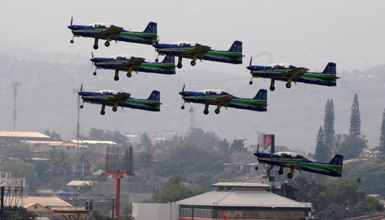 4月14日,巴西空军的特技飞行小队在洪都拉斯空军成立78周年纪念活动上进行特技飞行表演。