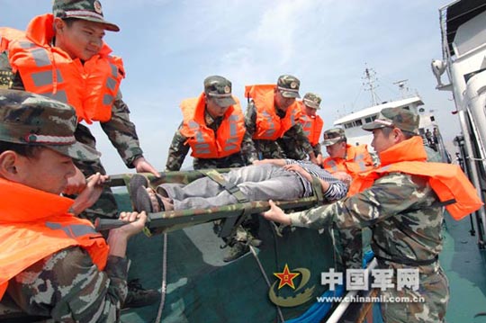 武警温州边防支队官兵将货轮上的“昏迷船员”转移到救护艇。