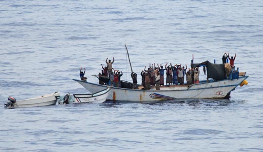 中新网4月19日电 当地时间18日,荷兰海军一艘军舰在索马里以北的亚丁湾解救了20名被海盗扣押的人质,同时还抓获7名海盗。 图为被荷兰海军军舰截获的船只,船上的人质和海盗举起了双手。