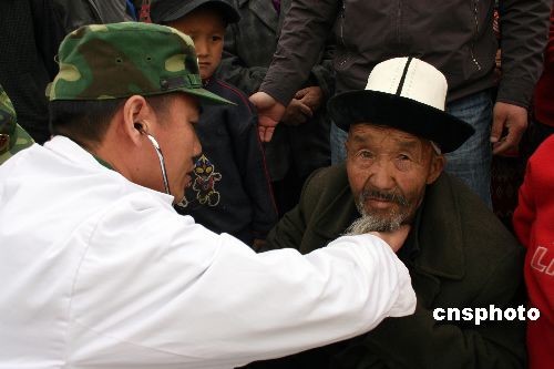 4月20日,解放军抗震救灾医疗救护队正为发生地震的新疆阿合奇县受灾群众检查身体。中新社发 刘新 摄