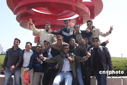 印度海军在青岛参加庆祝中国海军60周年活动后留影。中新社发 郭国权 摄