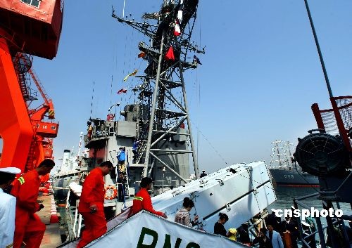 图:“海口”舰国旗军旗迎风招展庆祝海军60华诞