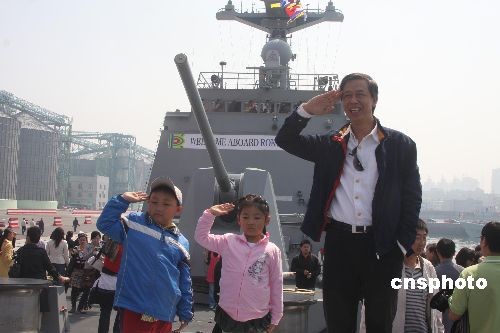 4月22日,纪念中国人民解放军海军成立60周年多国海军军舰开放日活动在山东省青岛港码头举行。图为三名参观者在韩国军舰上敬礼留影。中新社发 郭国权 摄