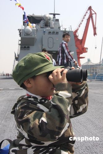 4月22日,纪念中国人民解放军海军成立60周年多国海军军舰开放日活动在山东省青岛港码头举行。图为一名小朋友在韩国独岛号上参观。中新社发 郭国权 摄