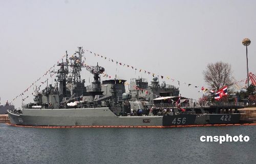 4月22日,纪念中国人民解放军海军成立60周年多国海军军舰开放日活动在山东省青岛港码头举行。图为停靠在青岛港的多国军舰。中新社发 郭国权 摄