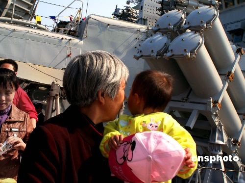 参加庆祝中国人民解放军海军成立60周年多国海军活动的各国舰艇停靠在青岛解放军海军码头,4月22日各国海军官兵相互登舰参观,同时各国舰艇对青岛市民开放,一些老人孩子也不放过这次机会。中新社发 宋吉河 摄