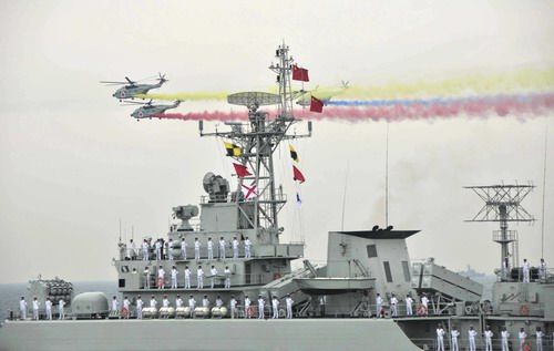 4月23日下午,为纪念中国人民解放军海军成立60周年而举行的海上阅兵在青岛附近黄海海域举行。中国海军的救护直升机拉出红、黄、蓝三色彩带。李刚 摄