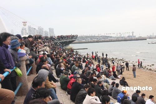 4月23日,为纪念中国人民解放军海军成立60周年而举行的海上阅兵在青岛附近黄海海域举行。众多市民在青岛奥运会帆船比赛海域观看海上阅兵队伍出入港口。中新社发 郭国权 摄