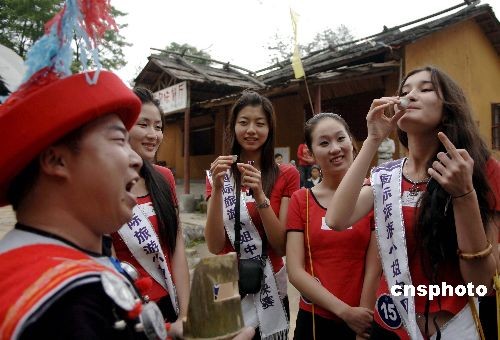 四月二十三日,参加2009国际旅游小姐中国总决赛的六十名选手在广东连南三排瑶寨与苗族同胞载歌载舞欢聚一堂。中新社发 刘卫勇 摄