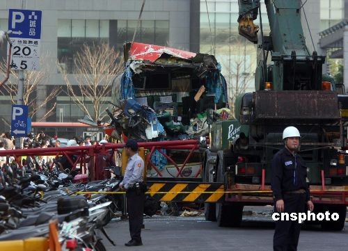 大陆广东旅游团一行二十五人四月二十四日下午一时五十四分左右到台北101参访,游览车行经松高路,一处工地起重机吊臂从三十七楼高空掉落,砸中游览车尾部,造成二人死亡。图为被砸的游览车后部。中新社发 耿军 摄