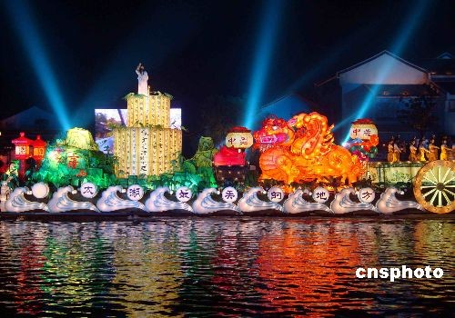 4月24日晚,第十二届中国苏州国际旅游节开幕式暨“水之缘”大型水上彩船巡游活动在苏州古运河上拉开帷幕,来自江浙沪各旅游城市,以及新加坡、日本、马来西亚、菲律宾、台湾等国家和地区的20条彩船在古运河上展示其风采,吸引了许多苏州市民和游客前来观赏。中新社发 王建康 摄