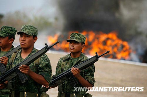 4月24日,在墨西哥南部蒙特雷的一个军事基地,墨西哥政府焚烧了在毒品交易中缴获的9吨多重的毒品,其中包括海洛因、可卡因和冰毒等。