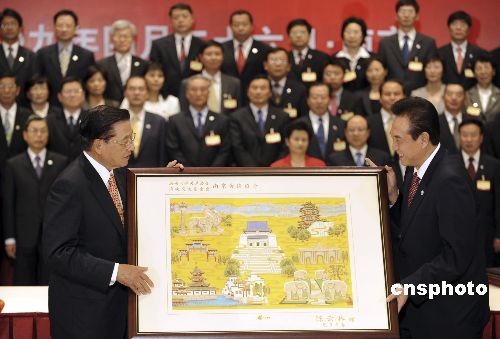 4月26日下午,陈云林向江丙坤赠送礼品“锦绣”,“锦绣”以江苏云锦制成,描绘着南京中山陵等著名景观。中新社发 廖攀 摄
