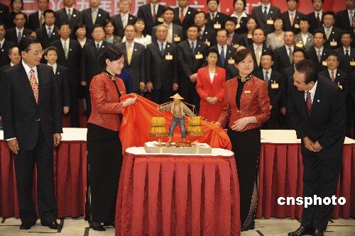 4月26日下午,江丙坤向陈云林赠送礼品皮雕。皮雕是一位台湾农民挑着满框南瓜的人物造型。中新社发 廖攀 摄