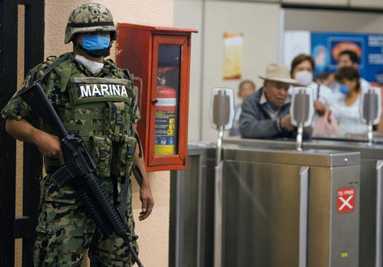 中新网4月27日电 墨西哥爆发猪流感疫情后,至今疑因感染这种新型病毒死亡的人数已达81人。墨西哥军方紧急出动,在公共场所加强守卫,并向群众发放口罩,严防猪流感疫情蔓延。图为26日,墨西哥军人戴着口罩在地铁站守卫。
