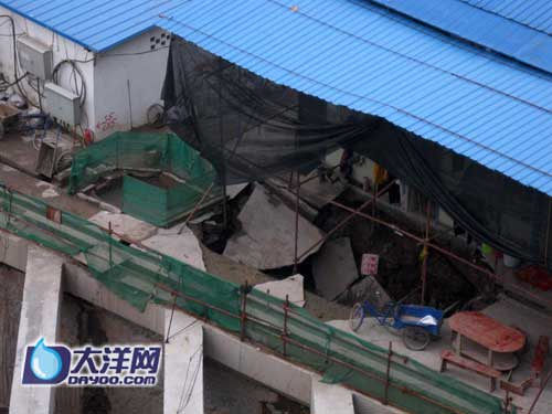 因工地大门紧闭,记者来到距离工地最近的小区——赤岗果园场小区。小区距地陷处约150米。在小区302房阳台上,记者看到,工地正在紧急施工向坑内填充混凝土及沙袋,还有几人正用专业仪器对周围进行勘测。