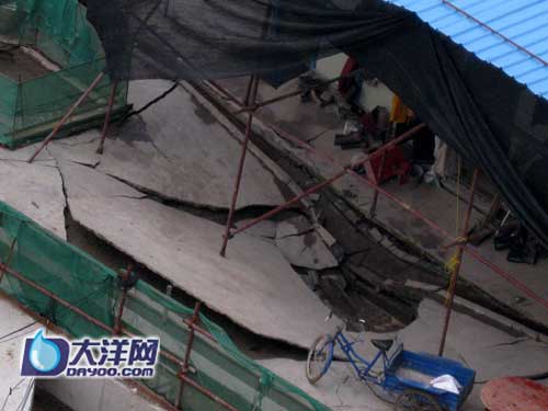 住在9楼的莫先生说,“当时是傍晚6时左右,突然听到一声响声,接着听到有人喊‘快跑,工地塌了’的声音。我们跑出来看,看到四五名工人向外狂奔,在他们身后我们看到一个1平方米左右的洞,后来这个洞慢慢变大,不断有积水涌出。大概在6时20分左右,又听到一声巨响,随后看见洞口周围10平方米的地面一下子沉降了下去。”