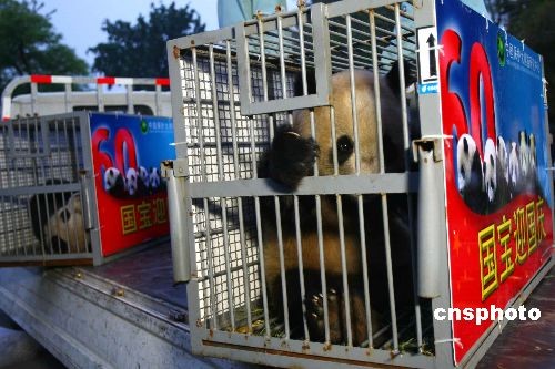 4月29日,6只国庆熊猫抵达北京动物园。为庆祝中华人民共和国成立60周年,北京动物园和卧龙自然保护区中国保护大熊猫研究中心合作举办为期一年的“国宝迎国庆”珍惜野生动物保护成果展系列活动,活动将宣传中国野生动物保护60年来取得的巨大成就。来京的6只熊猫分别为“华奥”、“锦意”、“香格”、“水灵”、“清风”、“文雨”,是2007年出生的亚成体大熊猫,将于五一期间与民众见面。