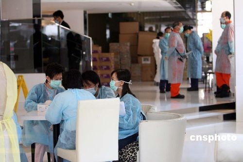 专业人员在因甲型H1N1流感而被隔离检疫的香港维景酒店陆续进行消毒,当局并为隔离人员提供食物及医疗物品。中新社发 洪少葵 摄