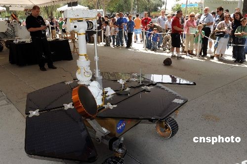 图为“机遇号”火星探测器的测试型号吸引众多参观者。