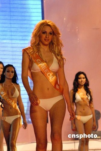 2009全球小姐国际城市大使大赛5月3日晚在昆明隆重举行,来自四十多个国家和地区的佳丽云集春城争芳斗艳,这也为同期举办的“中国昆明国际旅游文化节”增添亮色。图为此次大赛泳装秀现场。中新社发 保旭 摄
