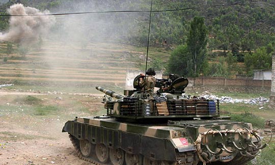 一辆巴基斯坦军方坦克在布内尔地区执行任务。