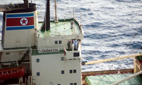 5月4日,韩国参谋长联席会议发言人称,在索马里附近海域值勤的韩国军舰当天清晨收到一艘朝鲜货船求救信号后,迅速派直升机驰援,赶走了向朝鲜货船靠近的海盗。图为韩国军方提供的照片显示一艘航行在索马里海域的朝鲜货船。