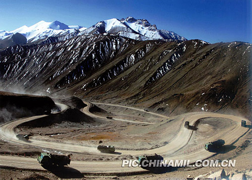 驻疆某汽车团的官兵每年有200多天驱车跋涉在这平均海拔4500米的“天路”上,这样的高度对常人来说是一个梦,对汽车兵来说却是一种毅力和韧性的考验,海拔的高度既是地理的高度,也是勇气的高度,更是人生的高度。年年岁岁、岁岁年年,勇敢无畏的汽车兵就是由此翻越奔向一个个与世隔绝的边防哨所。绿色的长龙就像流动的血液,不停地、艰难地穿越在这条重要的军事补给线上。