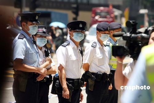 五月五日,香港确诊感染H1N1甲型流感的墨西哥男子入住的湾仔维景酒店隔离进入第五日,三百多名住客与酒店员工仍在内接受隔离。在酒店大堂外,大批戴口罩的警员在把守。特区政府表示,维景酒店最快于星期五才会解封。中新社发 洪少葵 摄