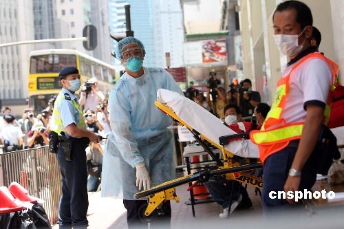 五月五日,在香港湾仔维景酒店被隔离旅客中,有人表示不适,身穿全套保护衣物的救护人员到场,但事主拒绝送院。中新社发 洪少葵 摄