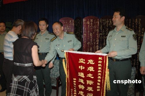 图为被救伤员代表向陆航团赠送了“危难之际展羽翼 空中通道铸忠魂”的锦旗,以表达对某陆航团官兵和失事机组家属的无限感激之情。中新社发 肖龙联 摄