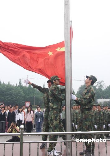 5月8日,四川省北川县北川中学新成立的“国旗班”学生在5.12地震一周年前夕举行升国旗仪式。5.12地震发生时,成都军区某红军师师长王凯和1500多名战友们第一时间赶到北川县,对北川中学的学生进行了抢救。官兵们和师生产生了深厚的感情,红军师和北川中学结为了军民共建单位,部队之前对北川中学新成立的“国旗班”学生进行了有关培训。当日,成都军区某红军师师长王凯和战友们给北川中学“国旗班”的12个学生送来了军装。并举行了新成立的“国旗班”学生首次升国旗仪式。中新社发 郭国权 摄