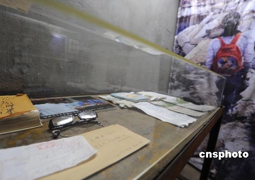 5月8日,汶川大地震博物馆筹备“5.12”一周年隆重大展中,收藏了新闻人物“范跑跑”的眼镜。中新社发 贾国荣 摄