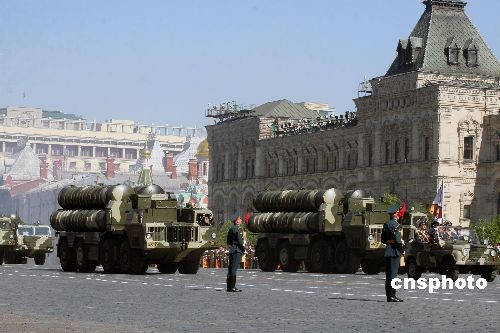 5月9日,俄罗斯在首都莫斯科红场举行盛大阅兵式,庆祝卫国战争胜利64周年,首次在红场展示了俄最新研发并陆续装备部队的S-400“凯旋”防空导弹发射系统。中新社发 田冰 摄