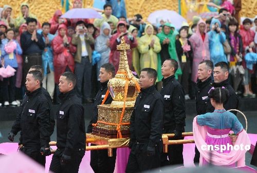 五月九日上午,合十舍利塔落成暨佛指舍利安奉大典在佛教圣地陕西省扶风县法门寺举行。佛指舍利伴随着一百零八位僧人念诵释迦牟尼佛圣号及四位高僧的大明咒,在雨中缓缓前行。中新社发 冽玮 摄