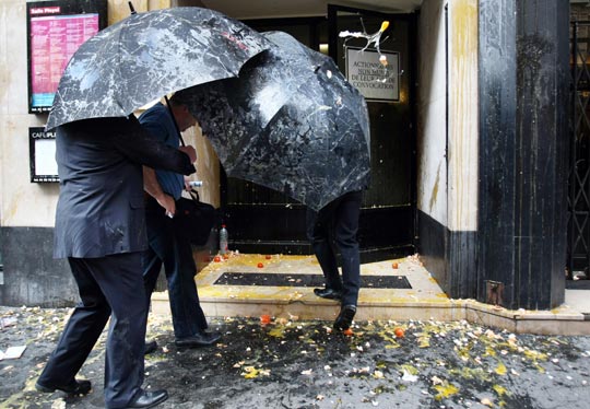 组图:法国一公司股东遭遇员工“鸡蛋雨”(2)