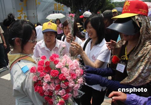 五月十日,台湾佛教团体以各种形式举办庆祝母亲节暨佛诞节活动。国际佛光会中华总会和佛光山寺采购了上万枝康乃馨,由童军小朋友赠送给女性市民。中新社发 耿军 摄