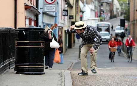 英国剑桥市30岁男子查理·卡维是一名身高近1.8米的壮汉,但人高马大的卡维经常抱着一把吉他躲进路边肮脏狭小的垃圾桶内,并自弹自唱。据悉,卡维独创的“垃圾桶卖唱”令他成为剑桥市的街头明星艺人,日前他甚至获邀参加了剑桥的街头艺术节。