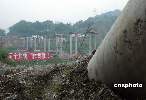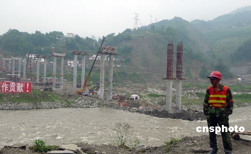 5月10日,四川省汶川县映秀镇百花大桥新桥正在原大桥遗址附近加紧施工建设。原映秀百花大桥在地震中被折成巨大的三节而彻底摧毁。中新社发 张晓理 摄