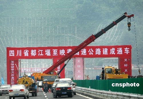 5月11日,施工队伍在刚刚建成的都江堰至映秀高速公路上搭建通车仪式彩门。在四川5·12地震中严重受损的成都至汶川高速公路的都江堰至震中映秀段建成,将于地震周年纪念日的5月12日通车。中新社发 任晨鸣 摄